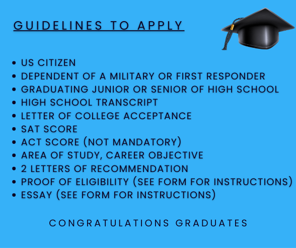 The Fredericksburg Fallen Heroes Scholarship is a prestigious award dedicated to honoring the selfless service and sacrifice of our first responders by investing in the future of their children. We are proud to announce 2- $1,000 scholarships available for two deserving students who has a parent serving or has served as a first responder. This scholarship is designed to provide financial assistance to support educational pursuits and recognize the unwavering commitment of our police officers, firefighters, EMTs, and paramedics. Eligible applicants graduating from high school are encouraged to demonstrate their academic achievements, community involvement, and the inspirational impact of having a first responder in their lives. Apply now for an opportunity to join a community that celebrates your family’s service and supports your educational journey.